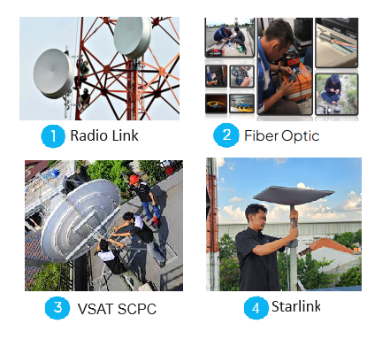 Our services ensure uninterrupted, high-quality communication while enhancing the resilience and security of your operations by combining several telecommunications technologies including fiber optic, radio link, VSAT SCPC, and Starlink internet satellite.